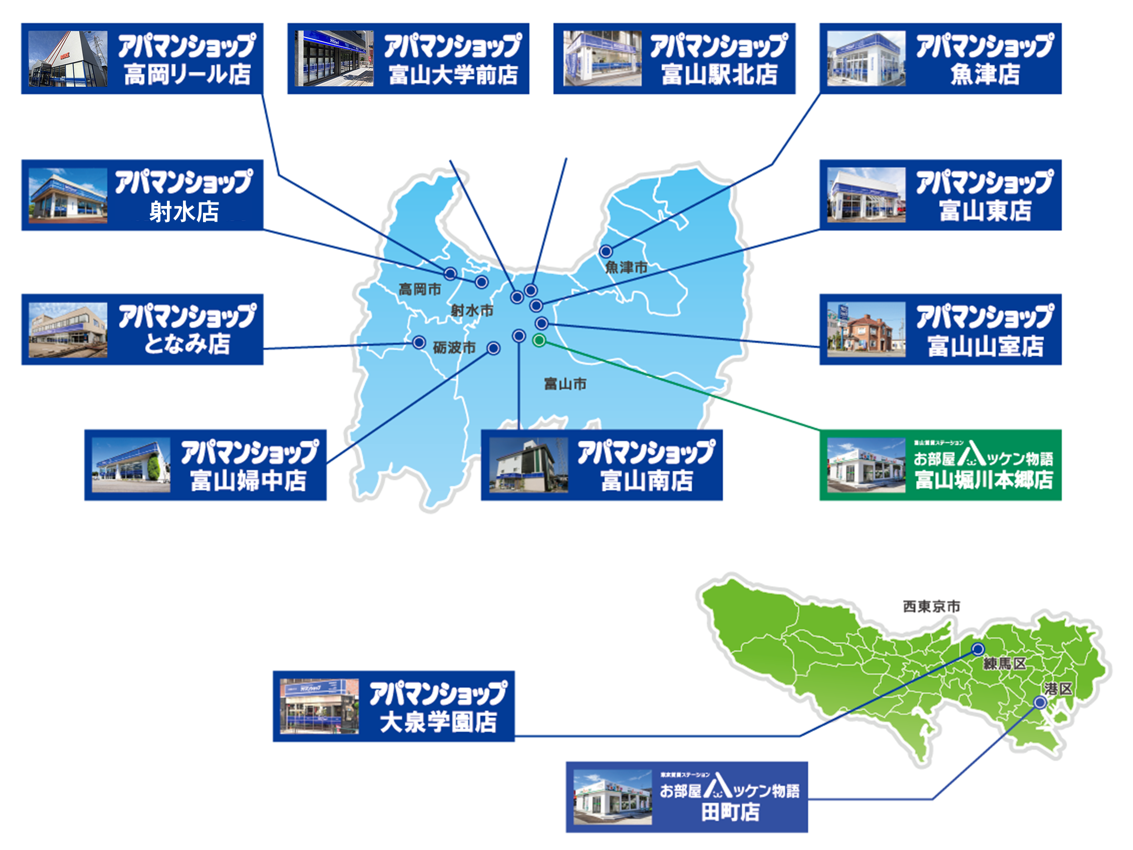 朝日不動産は、富山県内に賃貸仲介斡旋店舗を11店舗展開しています。県内全域に広がるネットワークと、地域に根差した豊富な情報量で、多様化する賃貸ニーズに対応することが可能となっています。また、貸主様のご協力による集客力の高いキャンペーンの実施など、物件とお客様のマッチング率を高めるための企画・提案を日々行っています。