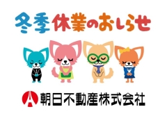 一覧に戻る Tweet 年末年始お休みのご案内 2025/12/23 平素より弊社をご利用いただき、ありがとうございます。 弊社冬季休業について、下記の通りご案内申し上げます。 誠に勝手ではございますが、何卒ご了承の程よろしくお願い申し上げます。 2025年12月28日(日)~ 2026年1月4日(日) 1月5日(月)より通常通り営業いたします。 冬期休業中のホームページへのお問い合わせにつきましては、休業明け以降のご返答とさせて頂きます。 2026年も、変わらぬご愛顧を賜りますよう宜しくお願い申し上げます。 朝日不動産株式会社 スタッフ一同