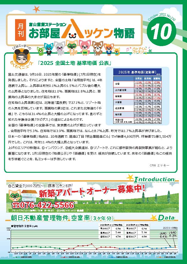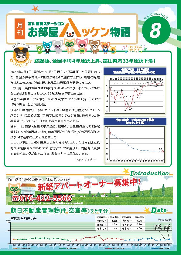 - 路線価、全国平均4年連続上昇、富山県内33年連続下落︕