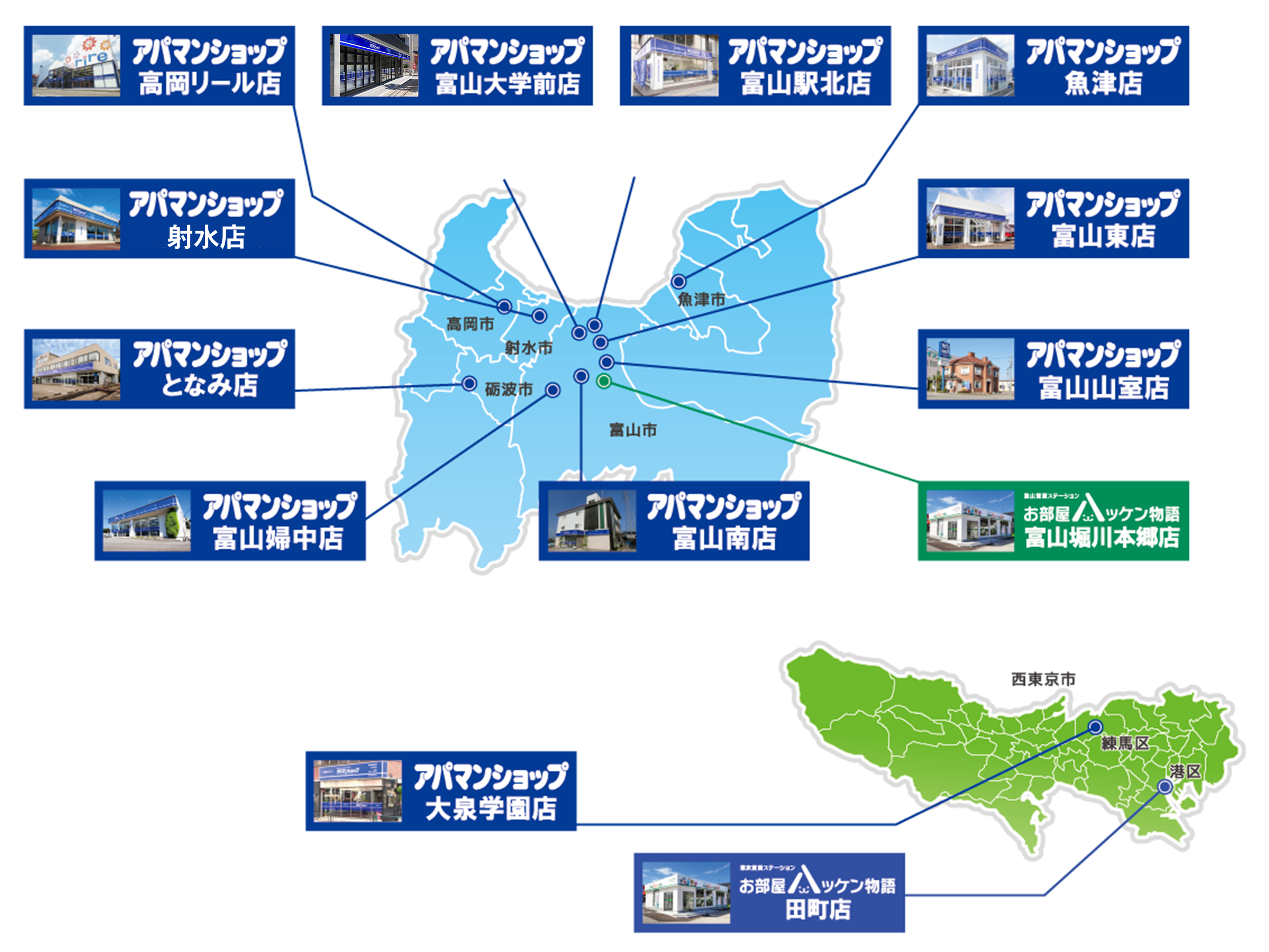 朝日不動産は、富山県内に賃貸仲介斡旋店舗を11店舗展開しています。県内全域に広がるネットワークと、地域に根差した豊富な情報量で、多様化する賃貸ニーズに対応することが可能となっています。また、貸主様のご協力による集客力の高いキャンペーンの実施など、物件とお客様のマッチング率を高めるための企画・提案を日々行っています。